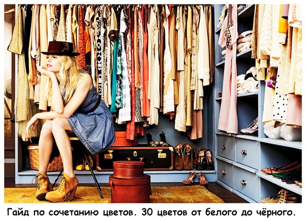 Гайд по сочетанию цветов. 30 цветов от белого до чёрного. 1. Белый: сочетается со всем. Наилучшее сочетание с синим, красным и черным. 2. Бежевый: с голубым, коричневым, изумрудным, черным, красным, белым.Показать полностью… 3. Серый – базовый цвет, хорошо сочетается с капризными цветами: фуксия, красный, фиолетовый, розовый, синий. 4. Розовый – с коричневым, белым, цветом зеленой мяты, оливковым, серым, бирюзовым, нежно - голубым. 5. Фуксия (темно – розовый) – с серым, желто-коричневым, зеленым лаймом, зеленой мятой, коричневый. 6. Красный – подходит к желтым, белым, бурым, зеленым, синим и черным. 7. Томатно – красный: голубой, зеленая мята, песчаный, сливочно – белый, серый. 8. Вишнево-красный: лазурный, серый, светло-оранжевый, песчаный, бледно-желтый, бежевый. 9. Малиново-красный: белый, черный, цвет дамасской розы. 10. Коричневый: ярко-голубой, кремовый, розовый, палевый, зеленый, бежевый. 11. Светло-коричневый: бледно-желтый, кремово-белый, синий, зеленый, пурпурный, красный. 12. Темно-коричневый: лимонно-желтый, голубой, зеленая мята, пурпурно-розовый, зеленый лайм. 13. Рыжевато-коричневый: розовый, темно-коричневый, синий, зеленый, пурпурный. 14. Оранжевый: голубой, синий, лиловый, фиолетовый, белый, черный. 15. Светло – оранжевый: серый, коричневый, оливковый. 16. Темно –оранжевый: бледно – желтый, оливковый, коричневый, вишнёвый. 17. Желтый: синий, лиловый, светло-голубой, фиолетовый, серый, черный. 18. Лимонно-желтый: вишнево-красный, коричневый, синий, серый. 19. Бледно-желтый: фуксия, серый, коричневый, оттенки красного, желтовато-коричневый, синий, пурпурный. 20. Золотисто-желтый: серый, коричневый, лазурный, красный, черный. 21. Оливковый: апельсиновый, светло-коричневый, коричневый. 22. Зеленый: золотисто-коричневый, оранжевый, салатный, желтый, коричневый, серый, кремовый, черный, сливочно-белый. 23. Салатовый цвет: коричневый, желтовато-коричневый, палевый, серый, темно-синий, красный, серый. 24. Бирюзовый: фуксия, вишнево-красный, желтый, коричневый, кремовый, темно-фиолетовый. 25. Электрик красив с золотисто-желтым, коричневым, светло-коричневым, серым или серебряным. 26. Голубой: красный, серый, коричневый, оранжевый, розовый, белый, желтый. 27. Темно-синий: светло-лиловый, голубой, желтовато-зеленый, коричневый, серый, бледно-желтый, оранжевый, зеленый, красный, белый. 28. Лиловый: оранжевый, розовый, темно-фиолетовый, оливковый, серый, желтый, белый. 29. Темно-фиолетовый: золотисто-коричневый, бледно-желтый, серый, бирюзовый, зеленая мята, светло-оранжевый. 30. Черный универсален, элегантен, смотрится во всех сочетаниях, лучше всего с оранжевым, розовым, салатным, белым, красным, сиреневатым или желтым.